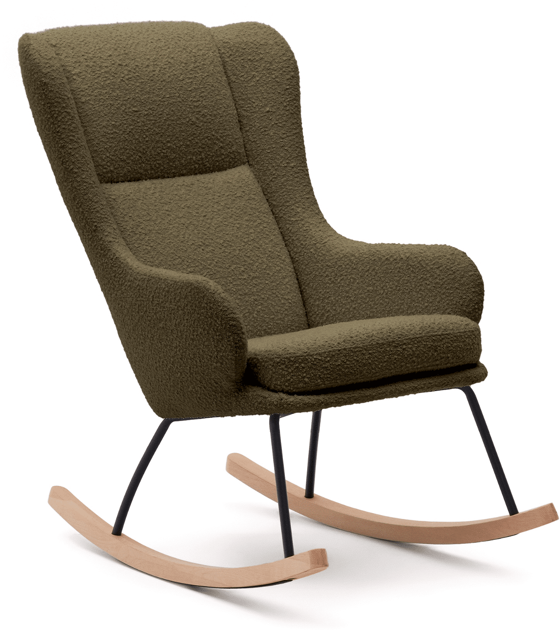 Gyngestol Kave Home Maustin grøn med polstret shearling-stof, sort stålstel og bøgetræsskøjter H106xB68xL95 cm